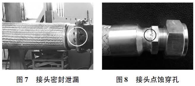 接頭的作用是將網(wǎng)套與波紋管聯(lián)接為一體,同時(shí),接頭又是金屬軟管與金屬軟管或其他管件、設(shè)備相聯(lián)接的部件。它保證介質(zhì)在管路系統(tǒng)中正常工作。常見的失效模式有密封泄漏、點(diǎn)蝕穿孔等形式,見圖7、圖8。