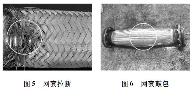 網(wǎng)套是由相互交叉的若干股金屬絲或若干條金屬帶按一定順序編織而成的,起著加強(qiáng)和屏蔽的作用。常見的失效模式有鋼絲、鋼帶、絲帶的拉斷及網(wǎng)套鼓包等形式,見圖5、圖6。